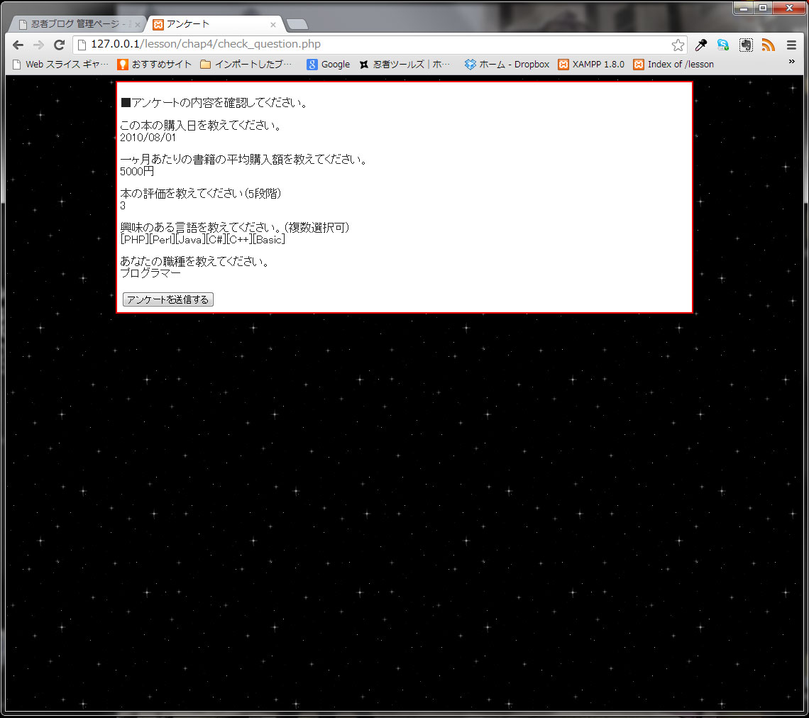 アンケートフォームの確認画面です。画僧はクリックで拡大できます。確認画面はCSSで装飾されています。本当はもっとシンプルな画面です。↓