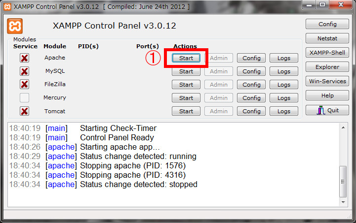 図の①のapacheのスタートボタンを押してapacheを起動させます。これでwebサーバーがapacheを通して、インターネットで公開されました。(※初めにDeny from All,Allow from localhost 127.0.0.1としてるので見れるのは自分だけですが。)