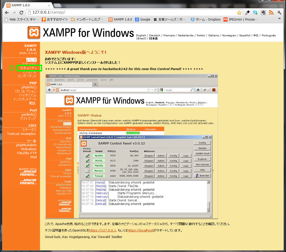 ⑤の「安全なXAMPPディレクトリを作成して下さい。」を押したら完了。これを設定することでローカルサーバーにユーザー名とパスワードがないとアクセスできなくなります。