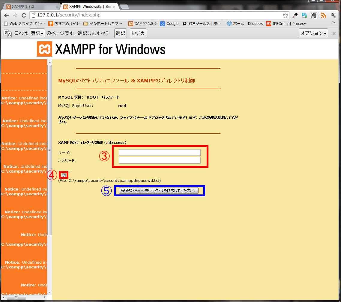 ④にチェックを入れるとXAMPPフォルダのsecurityフォルダの中にユーザー名とパスワードを書いたtextファイルが作られます。(※作るとほかの人にユーザ名とパスワード知られる可能性もあるかもなので、やっだったらチェックをはずしましょう。自分が忘れたらXAMPPをインストールしなおしです・・・ぎゃぴ。)